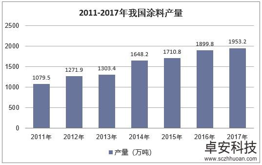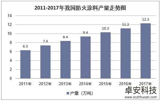 2017年我國涂料產量為1953.2萬噸,同比2016年增長了2.81%。近年來隨著建筑業的蓬勃發展以及我國消防法規的日益健全,消防工作越來越受到重視,防火涂料的研究也日漸深入,新品種不斷問世,它的不斷完善和快速發展將會為促進消防事業的發展,保護國家和人民群眾的生命財產安全發揮重大作用。在下游需求市場增長的推動下,我國防火涂料產量從2009年的4.6萬噸增長至2017年的12.3萬噸。