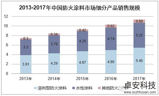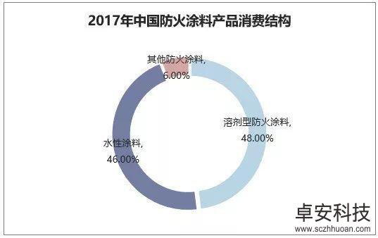 2017年我國市場上目前溶劑型防火涂料約占48%,水性涂料約占46%,其他約占6%,與西方發達國家的差距還有很大的差距。