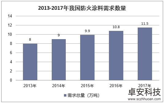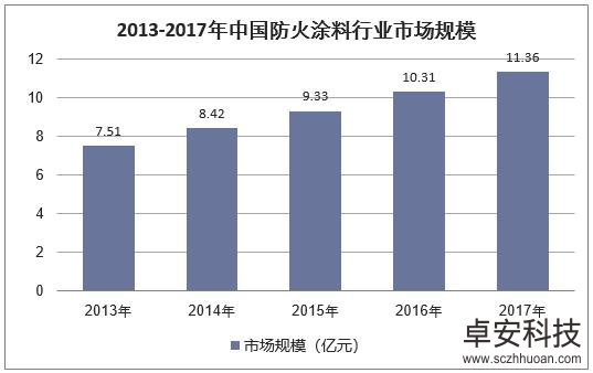 2017年,我國防火涂料行業市場規模約11.36億元,同比2016年的10.31億元增長了10.18%。